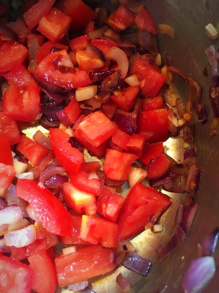Poté přidáme nakrájená rajčata s česnekem a chvíli podusíme.