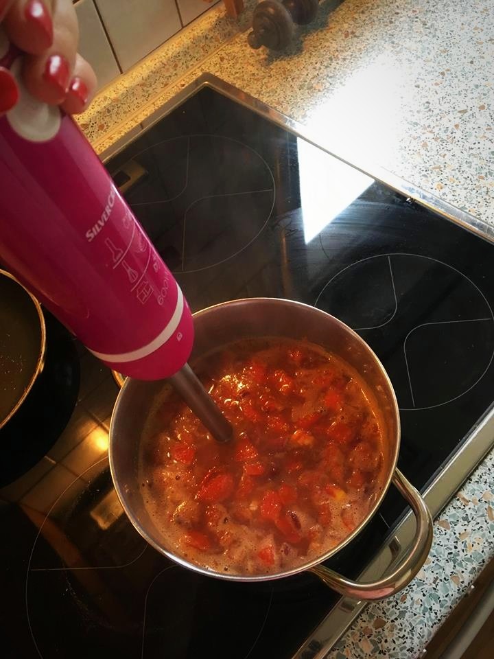 Po 15 minutách máme rajčata měkké, vezmeme tyčový mixér a důkladně promixujeme.